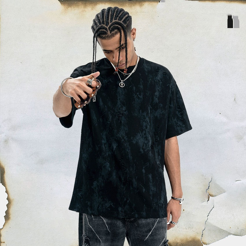 Ripped Edging Design Small Neckline Loose National Fashion Short Sleeve T-shirt